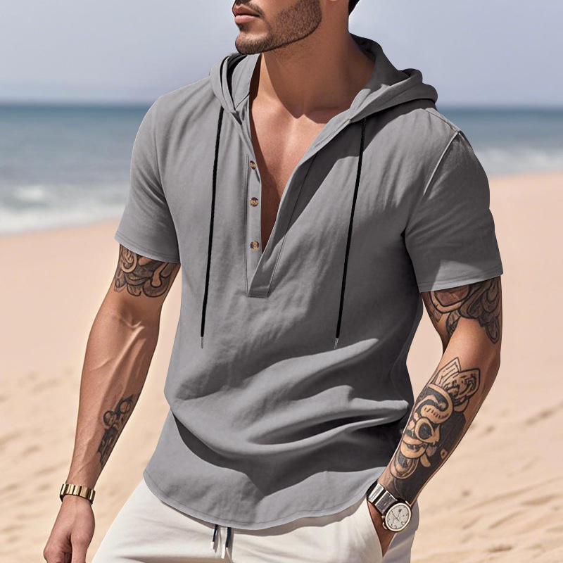 Breathable Linen Hooded Henley Shirt With Short Sleeves
